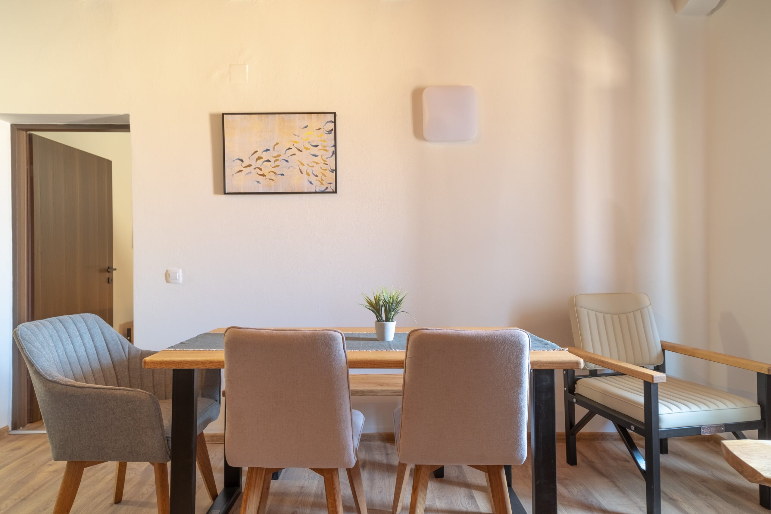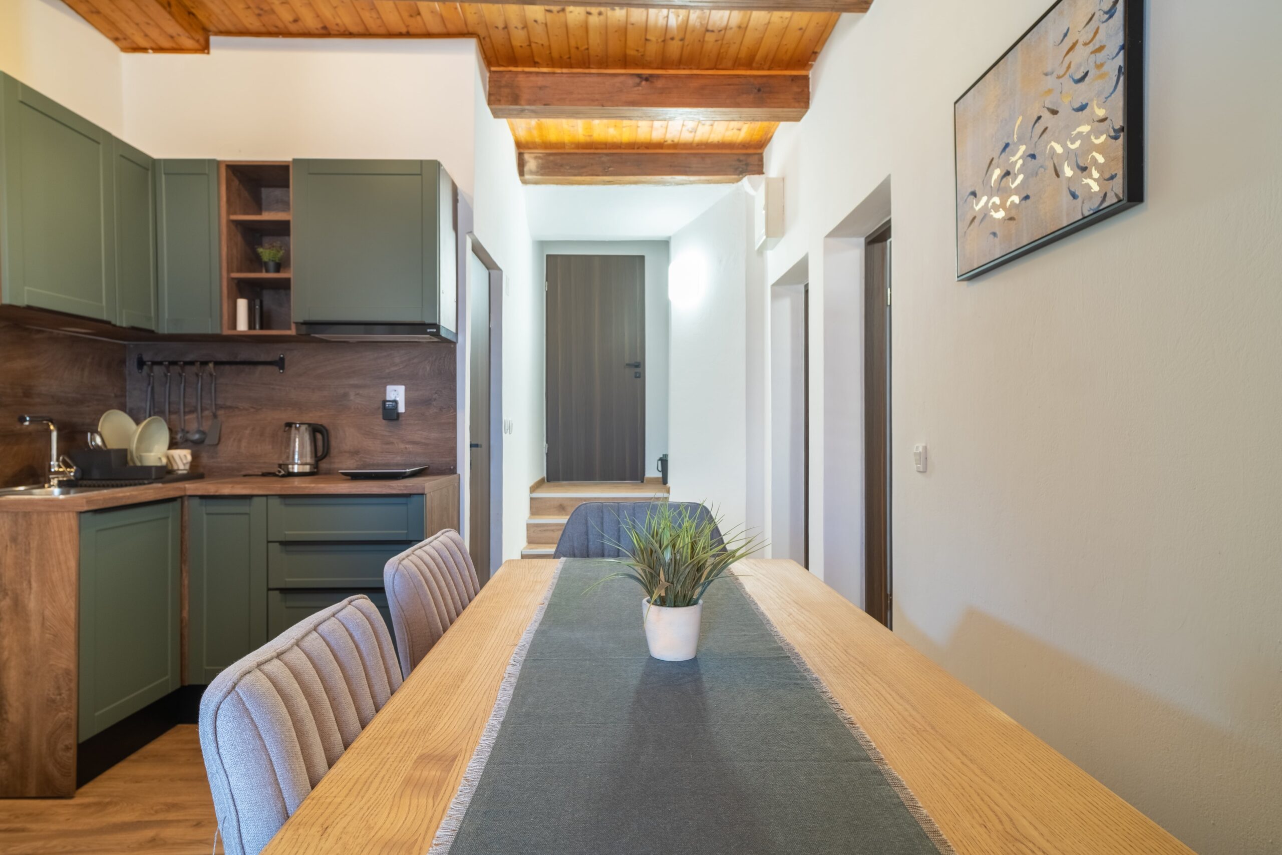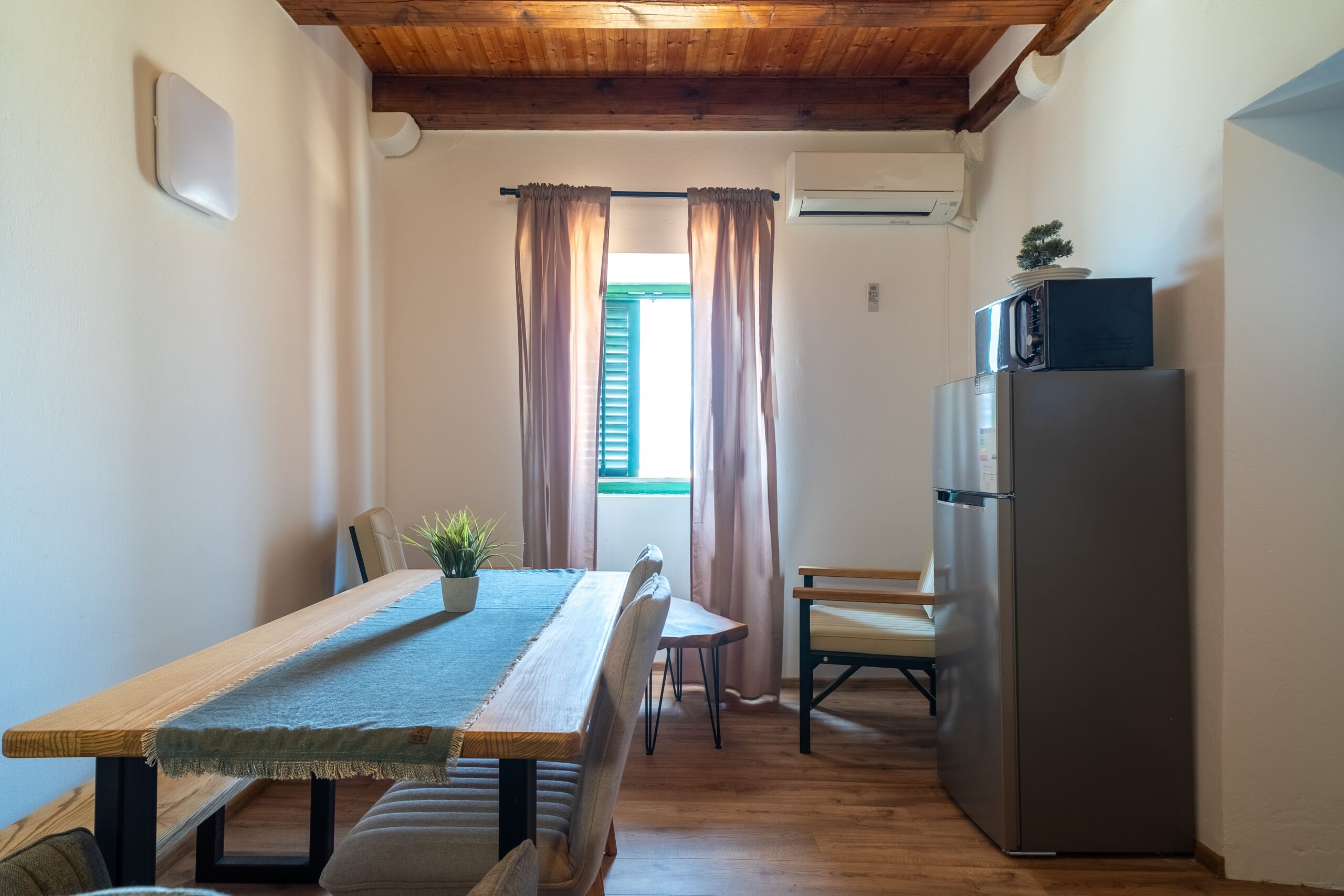 Teljes felújítás alatt esett át a közelmúltban, így a ház stílusához illő, de modern környezetben várja az érkező vendégeket. A nappaliban a konyha és az ebédlő rész kapott helyet. A konyhában két hordozható indukciós főzőlap, egy hordozható elektromos sütő, mikrohúllámú sütő, hűtőszekrény, kávéfőző, vízforraló található minden szükséges felszereléssel. A nappaliból közvetlen kijárat nyílik az utcafrontra és a kertre is. A nappaliból nyílik a fürdőszoba, valamint a két hálószoba is. A hálószobákban 160×200-as franciaágyak találhatóak, egyikben kiegészítve egy egyszemélyes ággyal, ezen kívül minden szoba külön-külön fel van szerelve a ruhák és egyéb kellékek tárolására szolgáló szekrényekkel. Minden apartmanunkra, így erre is egyaránt igaz, hogy használható a kert bármelyik része, klimatizált és Wifi-vel felszerelt.